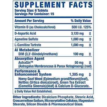 هر وعده از این پاراهورمون قدرتمند، حاوی شش قرص است. این میزان حاوی 500 IU ویتامین دی 3، 3120 میلی گرم دی آسپارتیک اسید آزاد، هزار میلی گرم آگماتین، 50 میلی گرم آستراژین، 2422 میلی گرم ترکیبات تستوژن است.