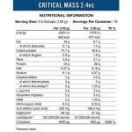 در هر وعده، Critical Mass حاوی 570 کالری در هر 150 گرم پودر است که حدود 75 گرم آن کربوهیدرات (فقط 3 گرم قند)، 42 گرم پروتئین، 5 گرم فیبر و 10 گرم چربی است.